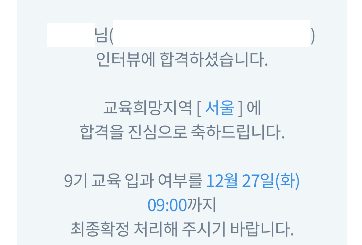 면접이 끝나고 나서는 압박 질문에 대해서 마지막에 답변을 못해서 망했구나! 라는 생각을 가지고 있었지만 최종 결과는 합격이었습니다! 하지만 SSAFY 결과가 나오기 전에 제가 취업준비를 한 기업에서 최종합격이 되어 SSAFY는 포기하게 되었습니다!